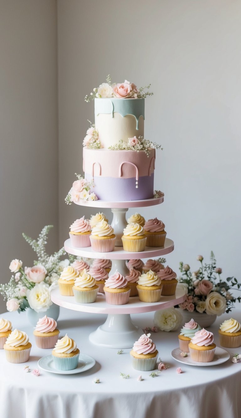This cupcake display radiates charm with soft pastel hues and delicate buttercream swirls. Surrounded by flowers and topped with a pastel cake, it’s an elegant focal point.