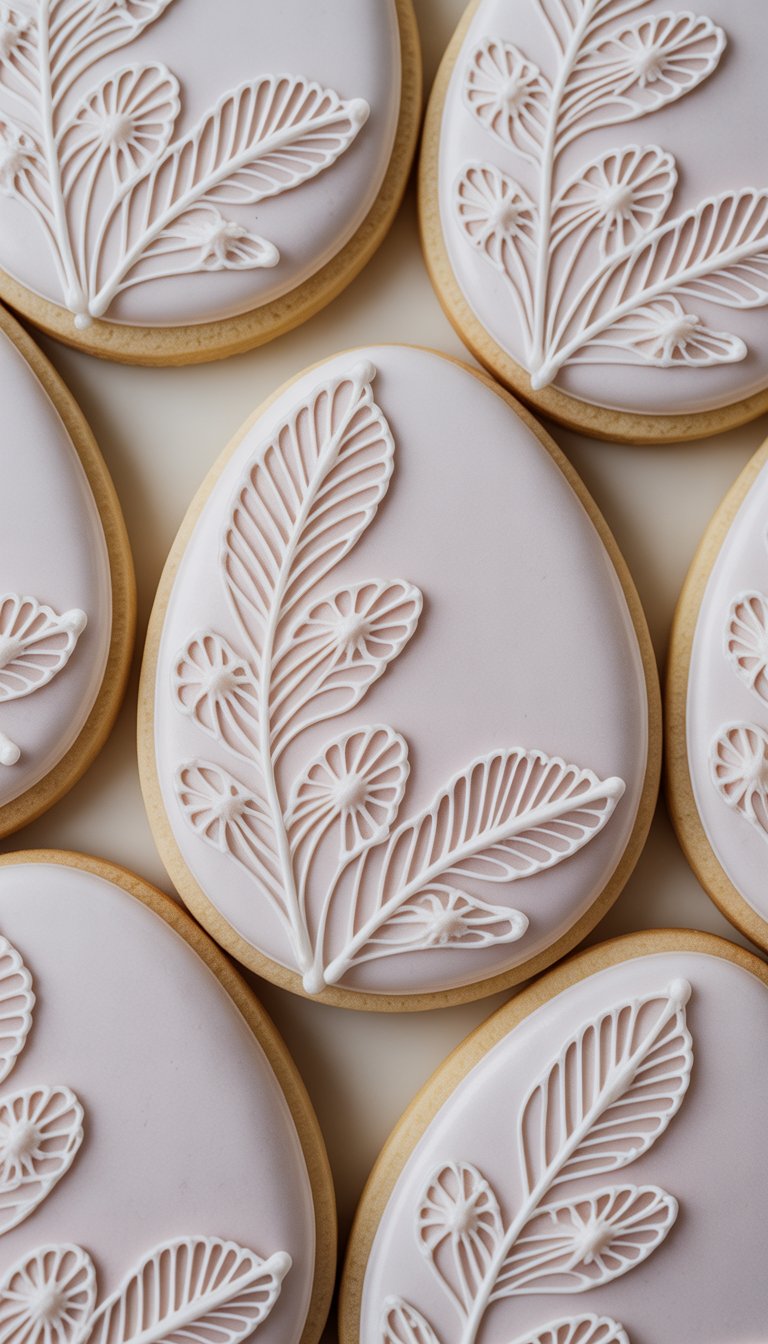 Elegant and intricate, these cookies showcase delicate leafy piping that looks like embroidery. Perfect for adding a refined, nature-inspired touch to your Easter cookie box.